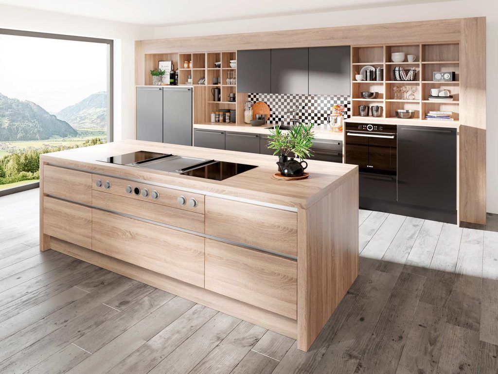 Čudesna kombinacija. Posebna prednost ovog modela su inovativni materijali poput antracitne, visokokvalitetne više puta lakirane fronte sa završnim premazom protiv otisaka prstiju. Tople boje drveta stvaraju osjećaj topline i ugode. Jedna od takvih boja je upravo nova boja Goldhorn koja stvara nevjerojatno realan izgled pravog drveta i tako unosi djelić prirode u vaš dom.